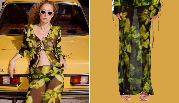 Gonna e camicia sono interamente realizzate in chiffon a fiori e sono disponibili dalla taglia S alla taglia L. La gonna è lunga fino alle caviglie ed è completamente trasparente. La chiusura all’altezza della vita è affidata a una coulisse con lacci regolabili che permette di adattare perfettamente la gonna alla figura. Costo del capo: 49,99 Euro.